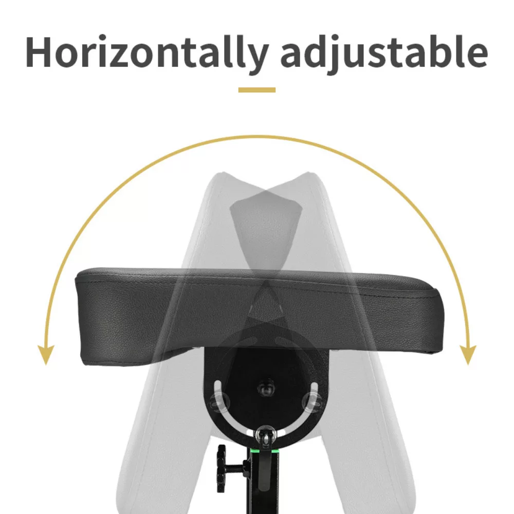 Die Armablage verfügt über eine in der Höhe verstellbare Spanne von 70–90 cm und lässt sich somit exakt an unterschiedliche Arbeitsumgebungen anpassen. Die am Kopfsegment einstellbare Neigung sowie die horizontale Verstellbarkeit ermöglichen eine optimale ergonomische Ausrichtung des Kundenkörpers. Für sicheren Halt sorgt ein besonders belastbares Fixiersystem, das vibrationsfreies Arbeiten ermöglicht und unerwünschte Bewegungen während der Arbeit verhindert.