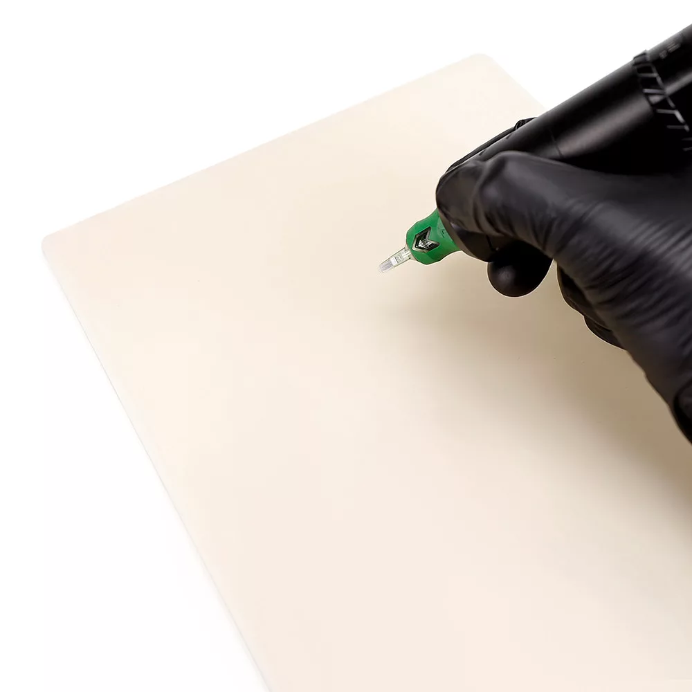 Die Tattoo-Übungshaut (A4 – 2 mm) – Weiß ist eine speziell für das Tattoo-Training entwickelte flüssigsilikonbasierte Arbeitsfläche. Das Design des Blattes hilft dabei, Maschinenführung und Nadeltiefe unter realitätsnahen Bedingungen, aber ohne Risiko zu üben. Die 2 mm Dicke ist die ideale Wahl: Sie ist stabil genug für den täglichen Gebrauch und zeigt sofort an, wenn die Nadel zu tief eindringt, sodass du sichere Handbewegungen entwickeln kannst.